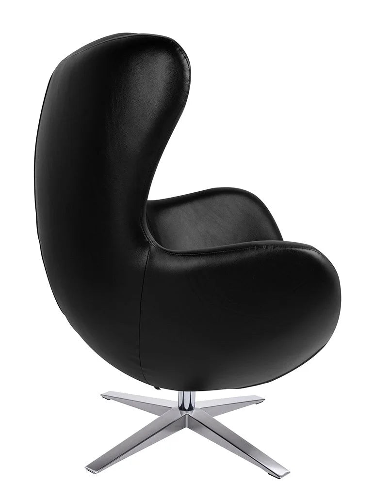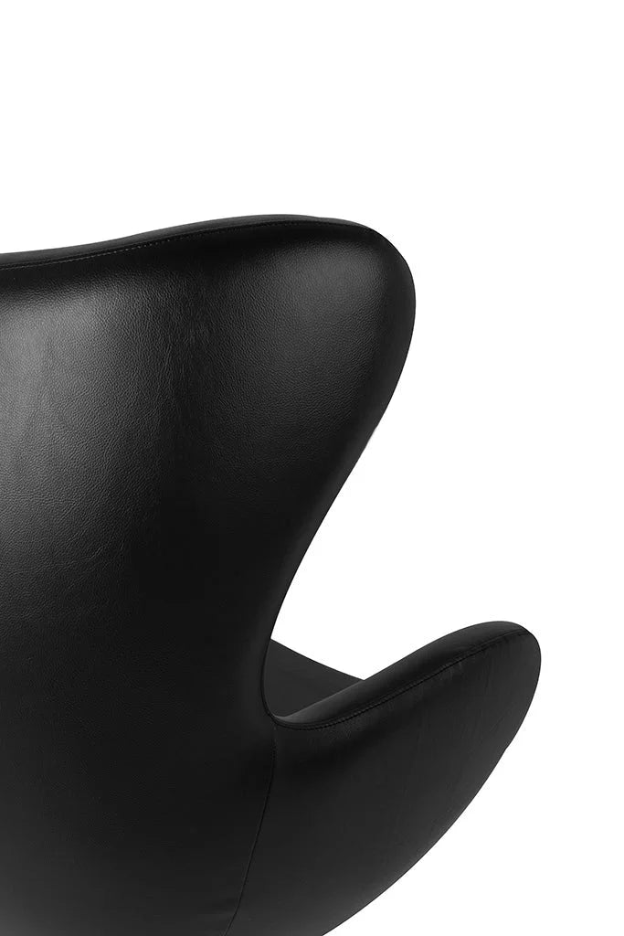 Fotel EGG SZEROKI kształtem nawiązuje do jednego z najbardziej znanych projektów. Fotel wyposażony jest w mechanizm obrotowy z funkcją bujania. Dodatkowo fotel można zablokować w pozycji odchylonej lub pionowej. Ciekawym elementem, jest dekoracyjny suwak na plecach fotela. Fotel tapicerowany jest ekoskórą w kolorze czarnym. Korpus fotela wykonany jest z metalu. Podstawa oraz uchwyt wykonane ze stali polerowanej. Wymiary: wys. 110 cm / szer. 80 cm / gł. 70 cm Wysokość do krawędzi siedziska: 44 cm Wysokość do podłokietników: 65 cm Waga netto: 22 kg Wymiary opakowania: 78 cm / 83 cm / 110,5 cm Sposób wysyłki: paleta.